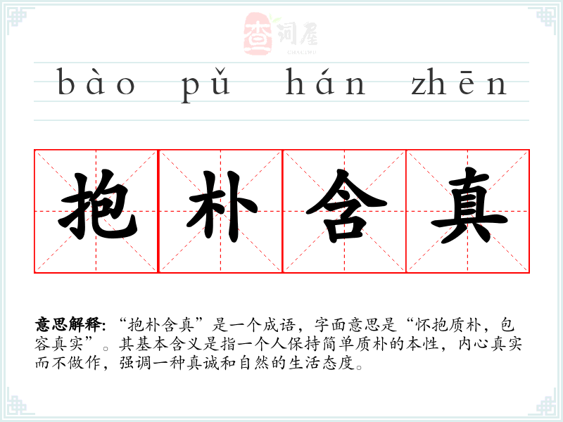 “抱朴含真”是一个成语,字面意思是“怀抱质朴,包容真实”。其基本含义是指一个人保持简单质朴的本性,内心真实而不做作,强调一种真诚和自然的生活态度。