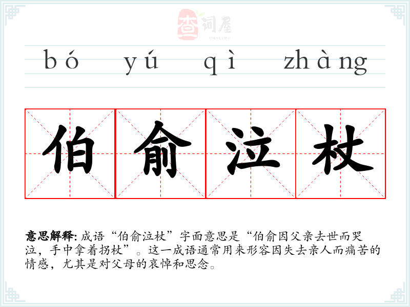 成语“伯俞泣杖”字面意思是“伯俞因父亲去世而哭泣,手中拿着拐杖”。这一成语通常用来形容因失去亲人而痛苦的情感,尤其是对父母的哀悼和思念。