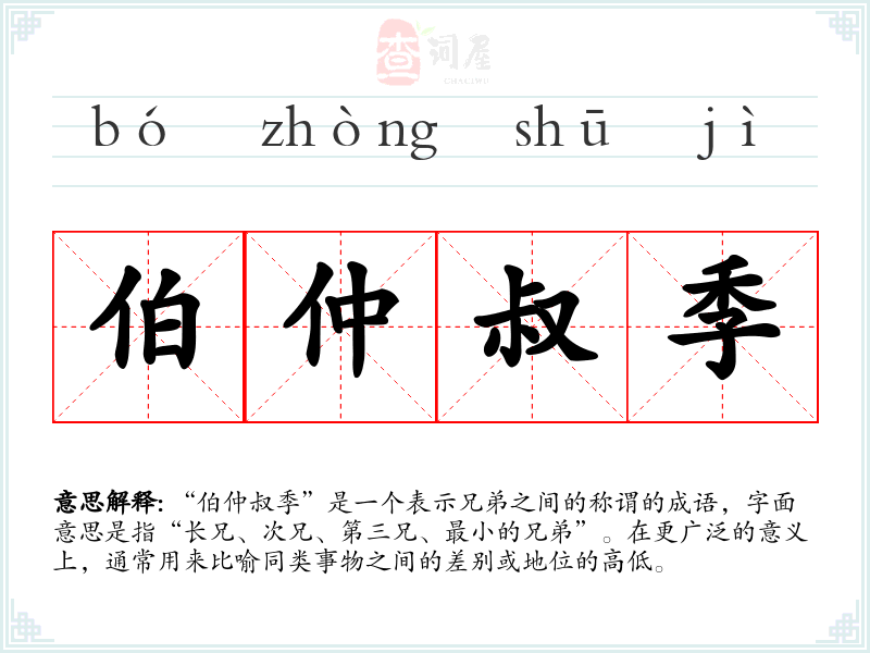 “伯仲叔季”是一个表示兄弟之间的称谓的成语,字面意思是指“长兄、次兄、第三兄、最小的兄弟”。在更广泛的意义上,通常用来比喻同类事物之间的差别或地位的高低。