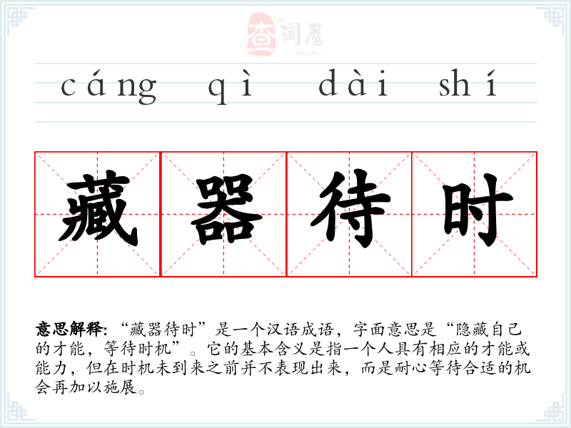 “藏器待时”是一个汉语成语,字面意思是“隐藏自己的才能,等待时机”。它的基本含义是指一个人具有相应的才能或能力,但在时机未到来之前并不表现出来,而是耐心等待合适的机会再加以施展。