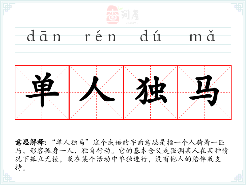 “单人独马”这个成语的字面意思是指一个人骑着一匹马,形容孤身一人,独自行动。它的基本含义是强调某人在某种情况下孤立无援,或在某个活动中单独进行,没有他人的陪伴或支持。