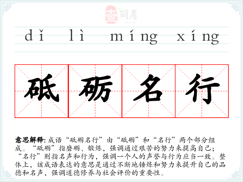 成语“砥砺名行”由“砥砺”和“名行”两个部分组成。“砥砺”指磨砺、锻炼,强调通过艰苦的努力来提高自己;“名行”则指名声和行为,强调一个人的声誉与行为应当一致。整体上,该成语表达的意思是通过不断地锤炼和努力来提升自己的品德和名声,强调道德修养与社会评价的重要性。