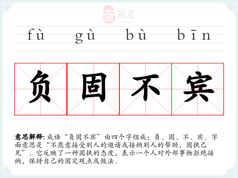 成语“负固不宾”由四个字组成:负、固、不、宾。字面意思是“不愿意接受别人的邀请或接纳别人的帮助,固执己见”。它反映了一种固执的态度,表示一个人对外部事物拒绝接纳,保持自己的固定观点或做法。