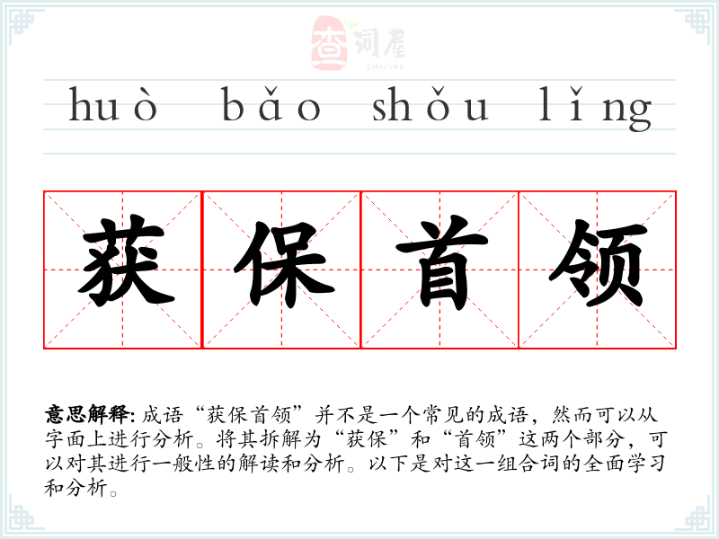 字面上,“获保”可以理解为“获得保护”,“首领”则是指领导者或首位人物。因此,“获保首领”可以理解为“获得保护的领导者”,暗示某个领导者在某种程度上得到了保护或支持。
