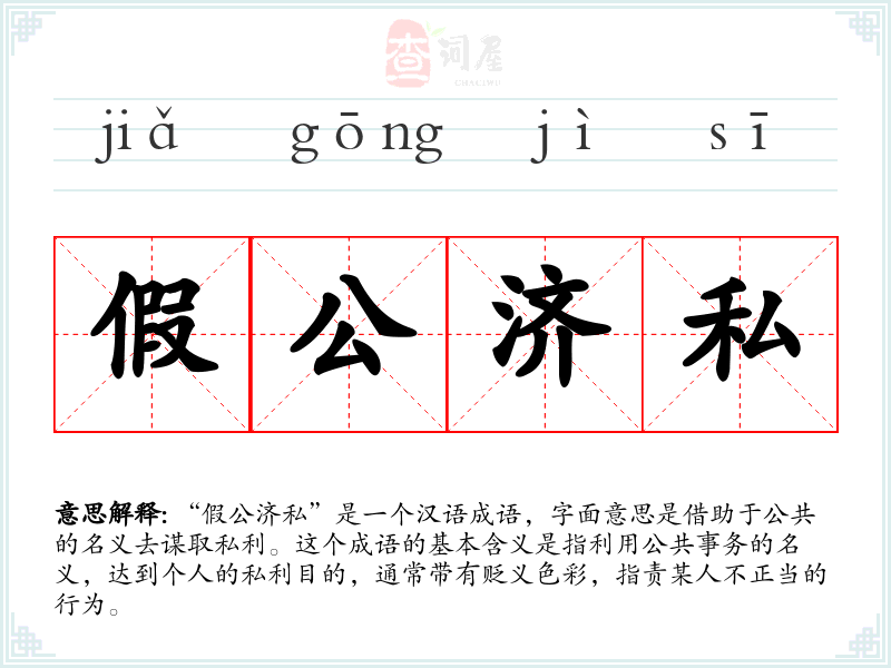 | 假公济私 | 假:借;济:帮助。假借公家的名义,谋取私人的利益。 |