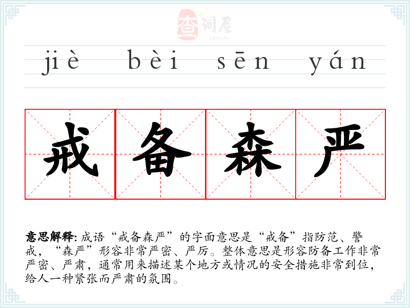 成语“戒备森严”的字面意思是“戒备”指防范、警戒,“森严”形容非常严密、严厉。整体意思是形容防备工作非常严密、严肃,通常用来描述某个地方或情况的安全措施非常到位,给人一种紧张而严肃的氛围。