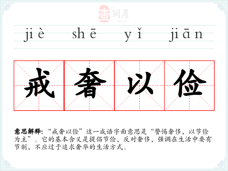 “戒奢以俭”这一成语字面意思是“警惕奢侈,以节俭为主”。它的基本含义是提倡节俭,反对奢侈,强调在生活中要有节制,不应过于追求奢华的生活方式。