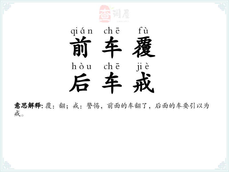 | 前车覆,后车戒 | 覆:翻;戒:警惕,前面的车翻了,后面的车要引以为戒。 |
