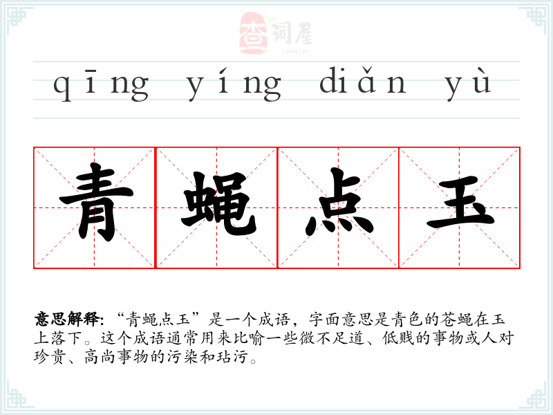 “青蝇点玉”是一个成语,字面意思是青色的苍蝇在玉上落下。这个成语通常用来比喻一些微不足道、低贱的事物或人对珍贵、高尚事物的污染和玷污。