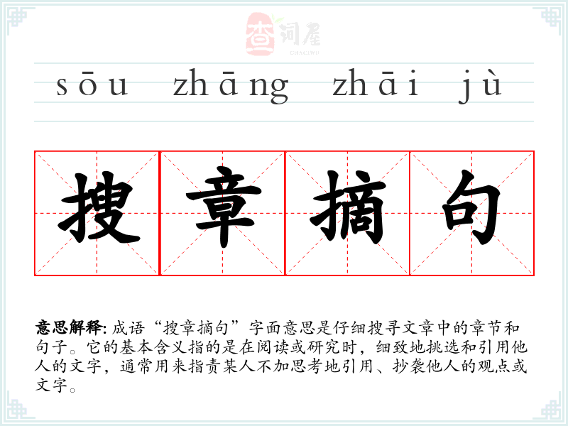 成语“搜章摘句”字面意思是仔细搜寻文章中的章节和句子。它的基本含义指的是在阅读或研究时,细致地挑选和引用他人的文字,通常用来指责某人不加思考地引用、抄袭他人的观点或文字。