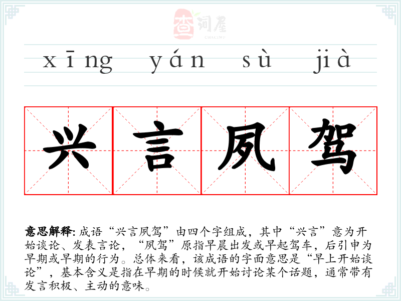 成语“兴言夙驾”由四个字组成,其中“兴言”意为开始谈论、发表言论,“夙驾”原指早晨出发或早起驾车,后引申为早期或早期的行为。总体来看,该成语的字面意思是“早上开始谈论”,基本含义是指在早期的时候就开始讨论某个话题,通常带有发言积极、主动的意味。