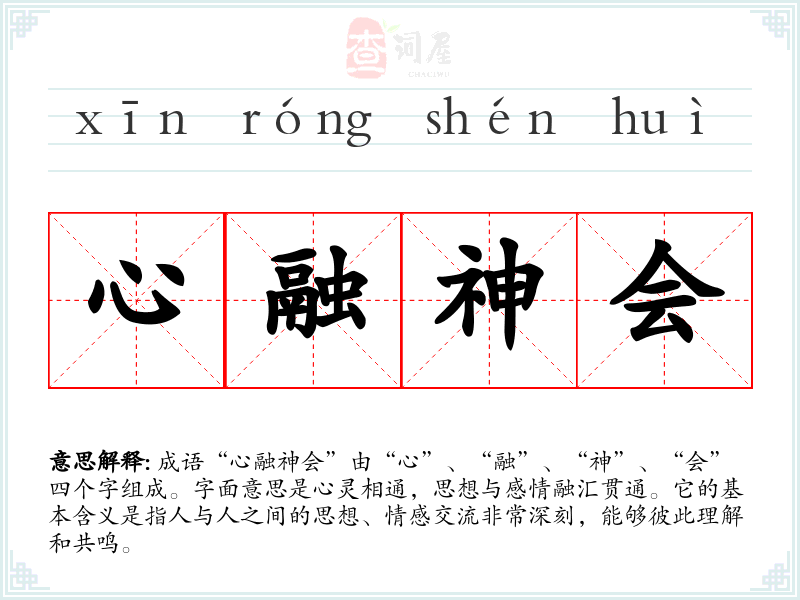 成语“心融神会”由“心”、“融”、“神”、“会”四个字组成。字面意思是心灵相通,思想与感情融汇贯通。它的基本含义是指人与人之间的思想、情感交流非常深刻,能够彼此理解和共鸣。