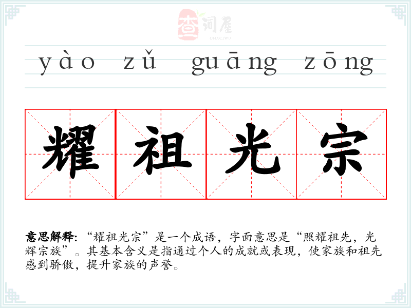 “耀祖光宗”是一个成语,字面意思是“照耀祖先,光辉宗族”。其基本含义是指通过个人的成就或表现,使家族和祖先感到骄傲,提升家族的声誉。