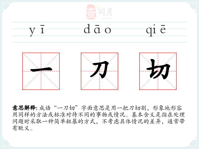 成语“一刀切”字面意思是用一把刀切割,形象地形容用同样的方法或标准对待不同的事物或情况。基本含义是指在处理问题时采取一种简单粗暴的方式,不考虑具体情况的差异,通常带有贬义。